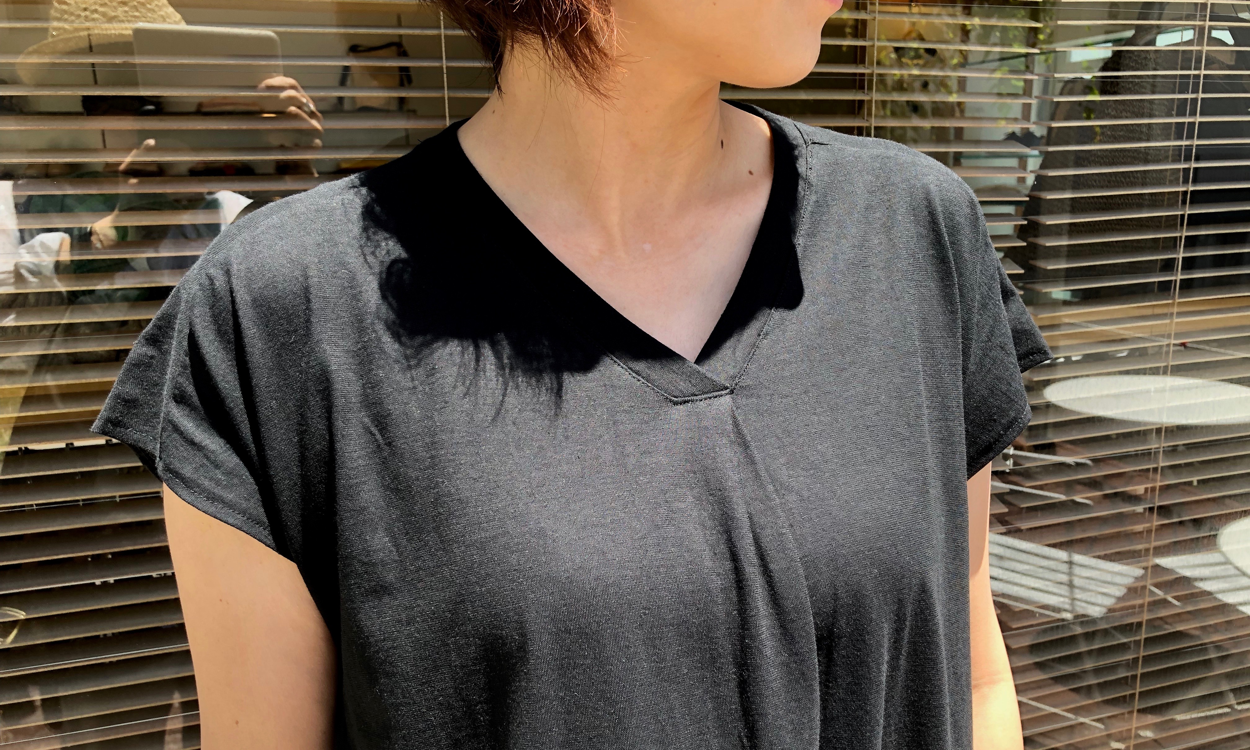 浅めのVネックに、肩に乗る袖で、すっきりとした印象に。