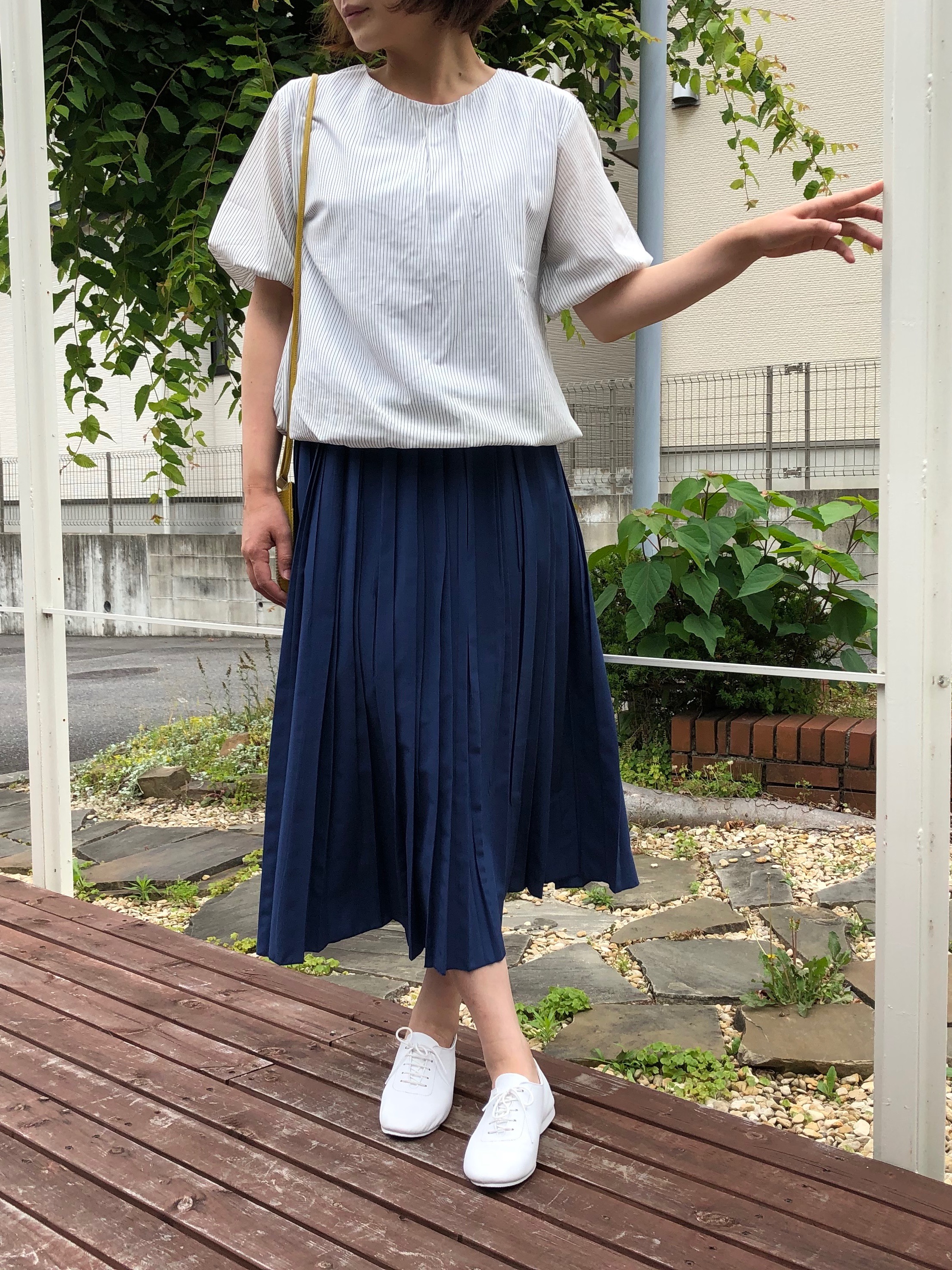 甘さ控えめな方は、ネイビーがいいかもしれません。くるぶし丈のロングスカートにもバランスよくコーディネートしていただけます。