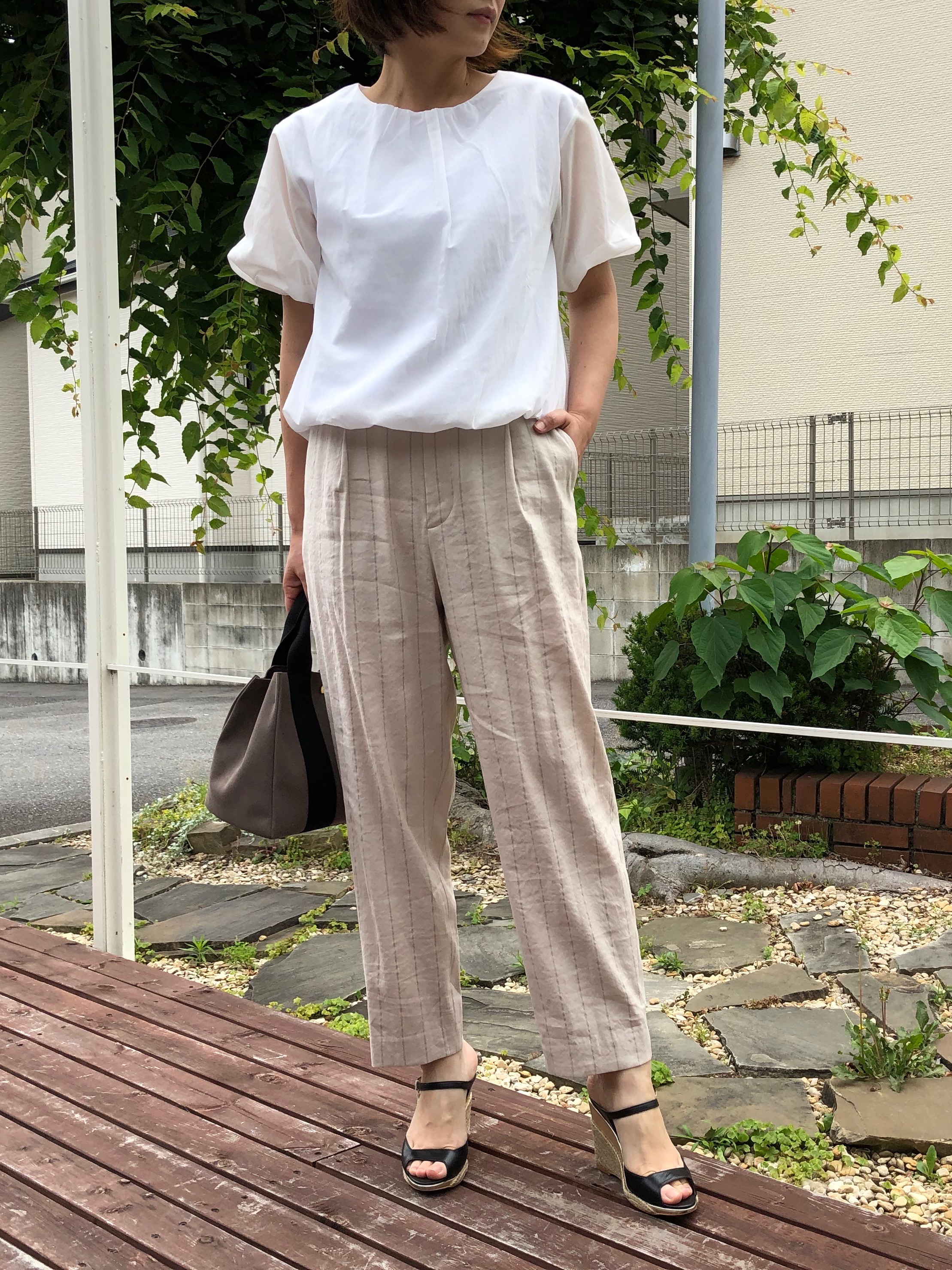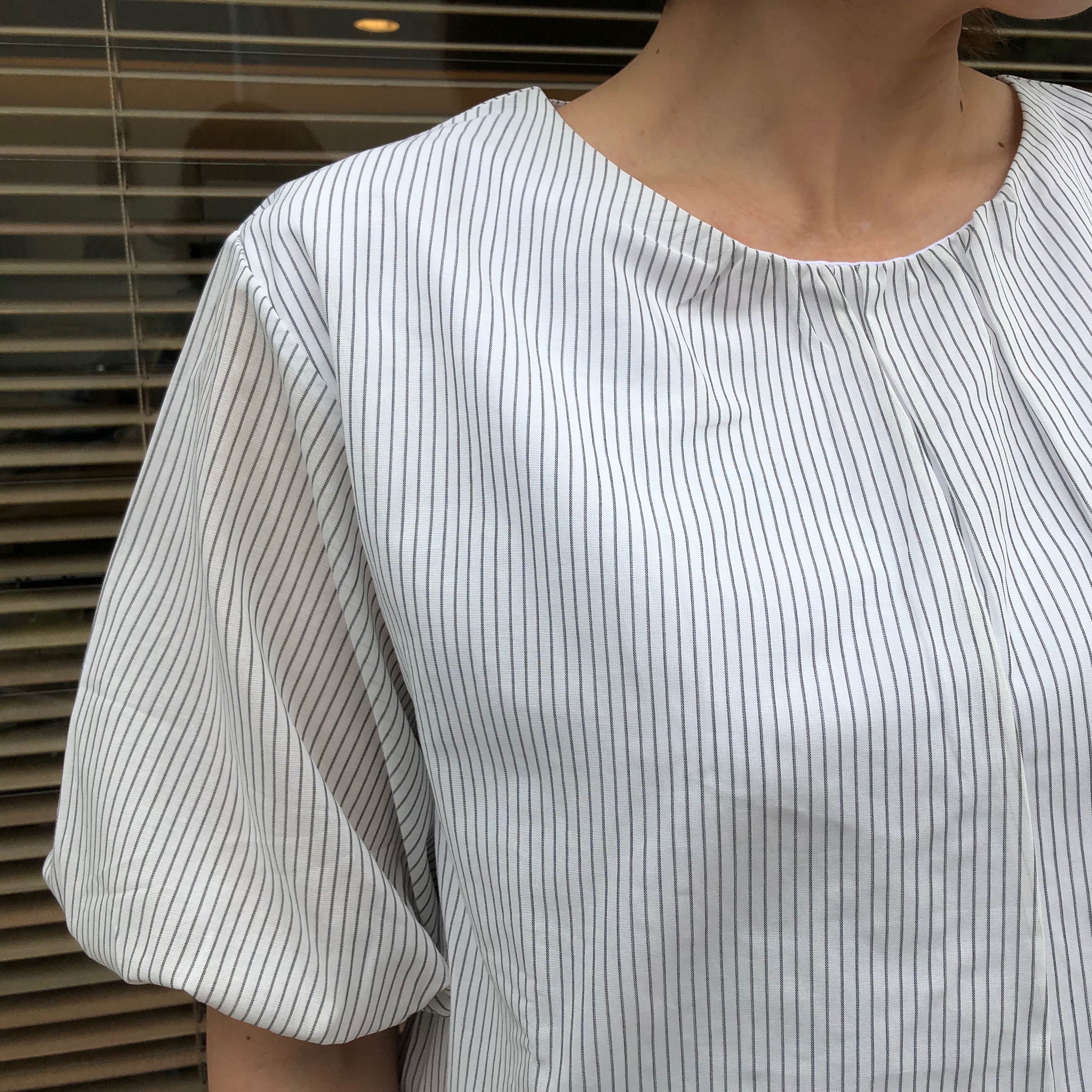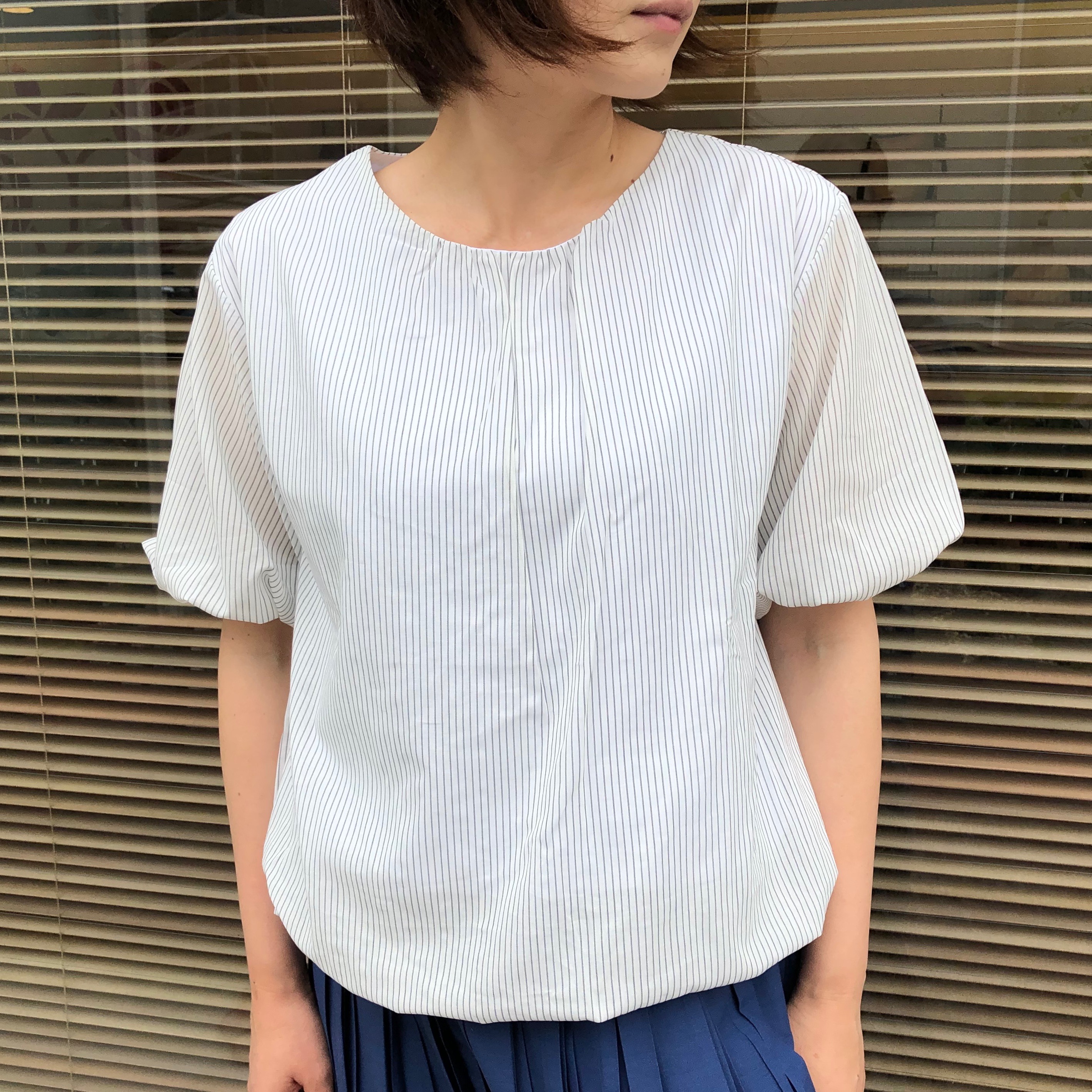 細いストライプで、清涼感のあるブラウスになっています。