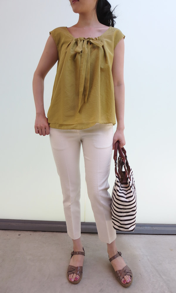 洗いをかけたコットンシルク素材で柔らかい雰囲気に仕上げたブラウス&レース柄パンツで上品なコーデに仕上げてみました。エナメルのエスパドリューやブラウンのボーダーバックも良い感じ。