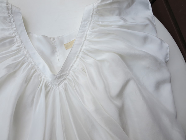 シルクのウォッシャブル素材の素敵なブラウス&小花柄パンツのフェミニンコーディネイト。ネックラインのたっぷりのギャザーが、シルクの柔らかい素材と相まって、とても大人っぽいデザインです。