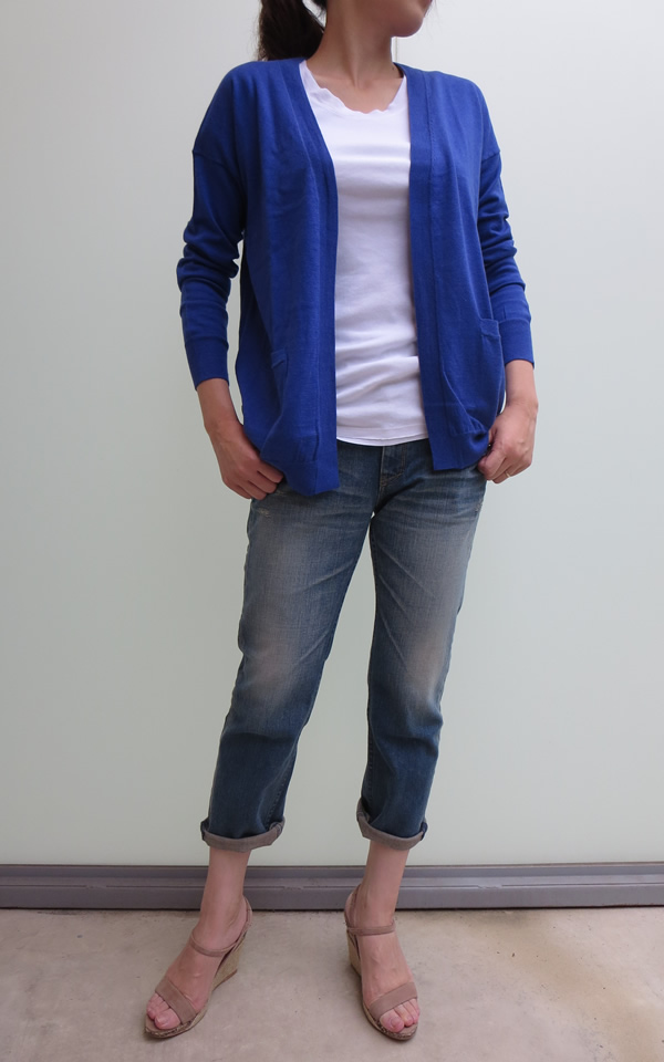上と同じコットン素材のオープンカーディガン。リラックスした気分で、より華奢でフェミニンな雰囲気に仕上がります。ヒップを隠してくれる着丈もGOOD!