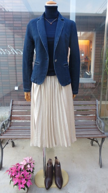 【YANUK】のデニット素材のジャケットは、伸縮性もあり着心地抜群!春先は、とっても重宝しそうです。【Harriss】の柔らかなハイゲージニット&【Harriss Grace】のプリーツスカートでスッキリとしたキレイ目カジュアルスタイルの完成です。
