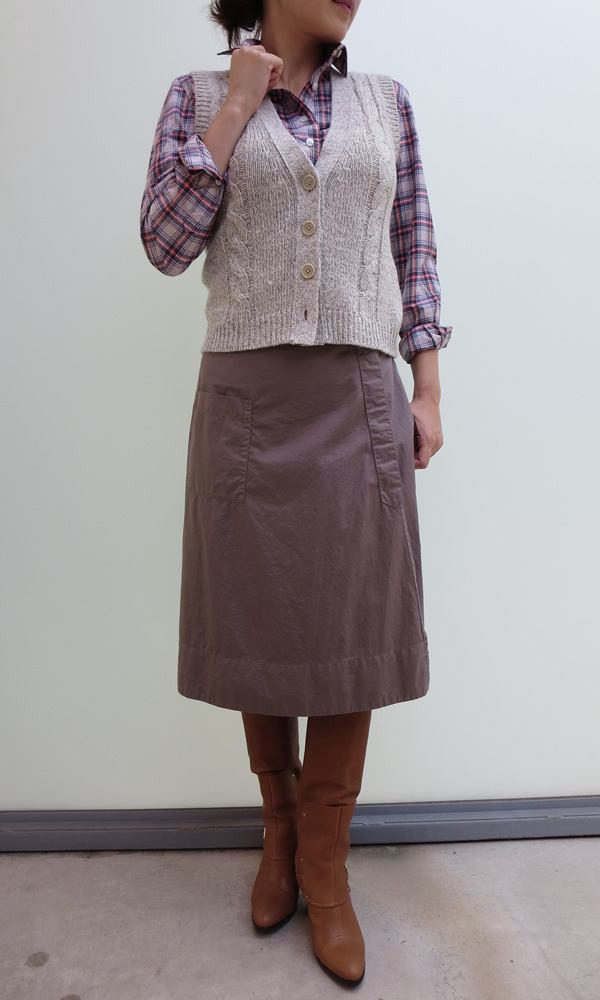 ざっくりと編まれたケーブル編みの表情が優しい雰囲気を醸し出しているニットベスト&ラップスカートのコーディネイト。チェックシャツを合わせて、今年トレンドのトラッドテイストの着こなしです。