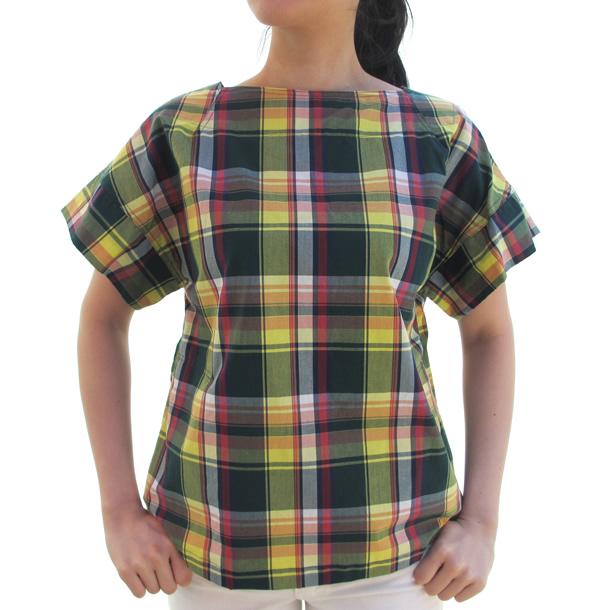 鮮やかなチェック柄が、目を惹くコットン素材のプルオーバーシャツ。程よい開きのボートネックが、デコルテをきれいに演出してくれます。腕をほっそりと華奢に見せてくれる広めの袖口もポイントです。