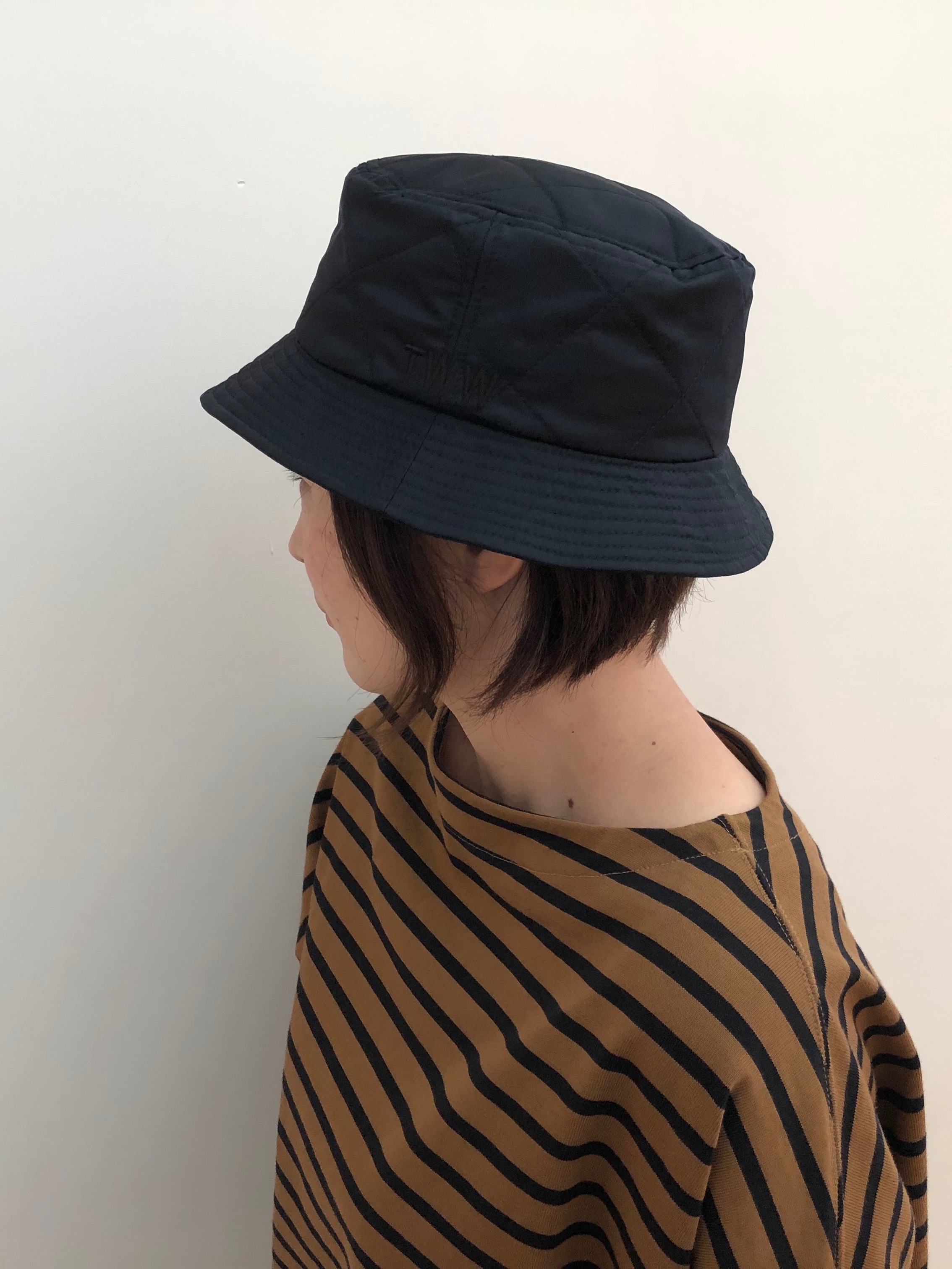 去年くらいから爆発的に人気の上がっている、バケットハットが登場です。なかなか手を出せなっかた方も、黒のような濃い色からトライしていただくと、取り入れやすいと思います。