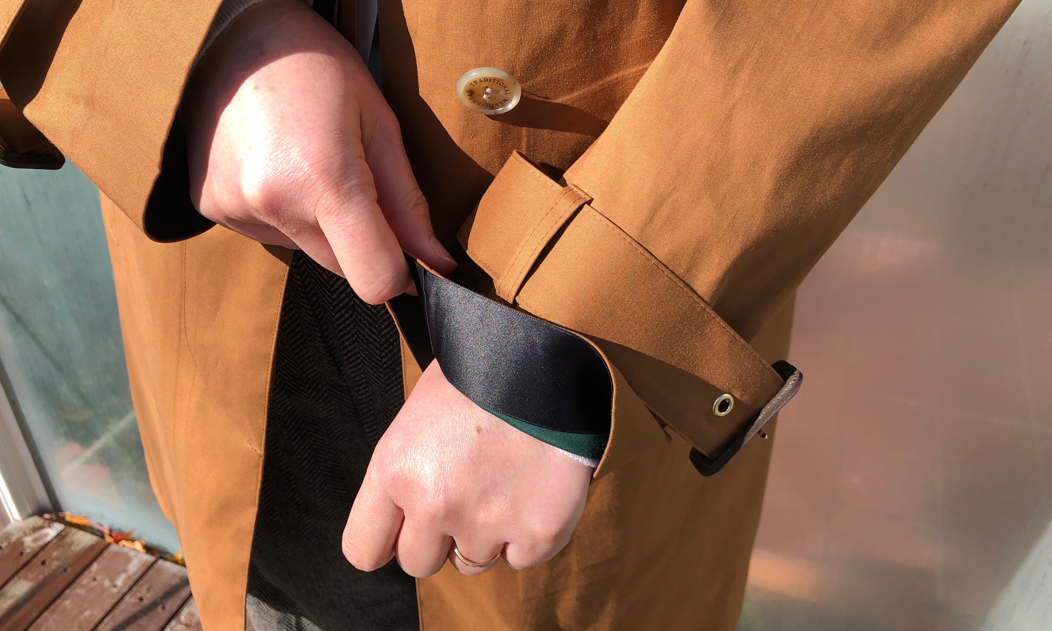 袖口(裾も)には、ゴム引きコートのラバーテープのようにサテンテープを熱圧着し、素材の強度が増すとともにアクセントにもなっています。また、ステッチからの水の侵入を防ぐシームテープが裏側に施されていて、『MACKINTOSH』の伝統を体感していただるコートになっています。