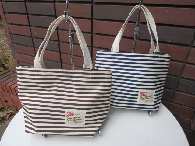 こちらは、定番人気のミニトート。程よくコンパクトなサイズで、ちょっとしたお出かけやランチバッグとしても大活躍です。ポーチと同じく、リバティ柄(表面にPVC加工)とデニム、そして下の写真のボーダー2色(ブラウン、ネイビー)ございます。