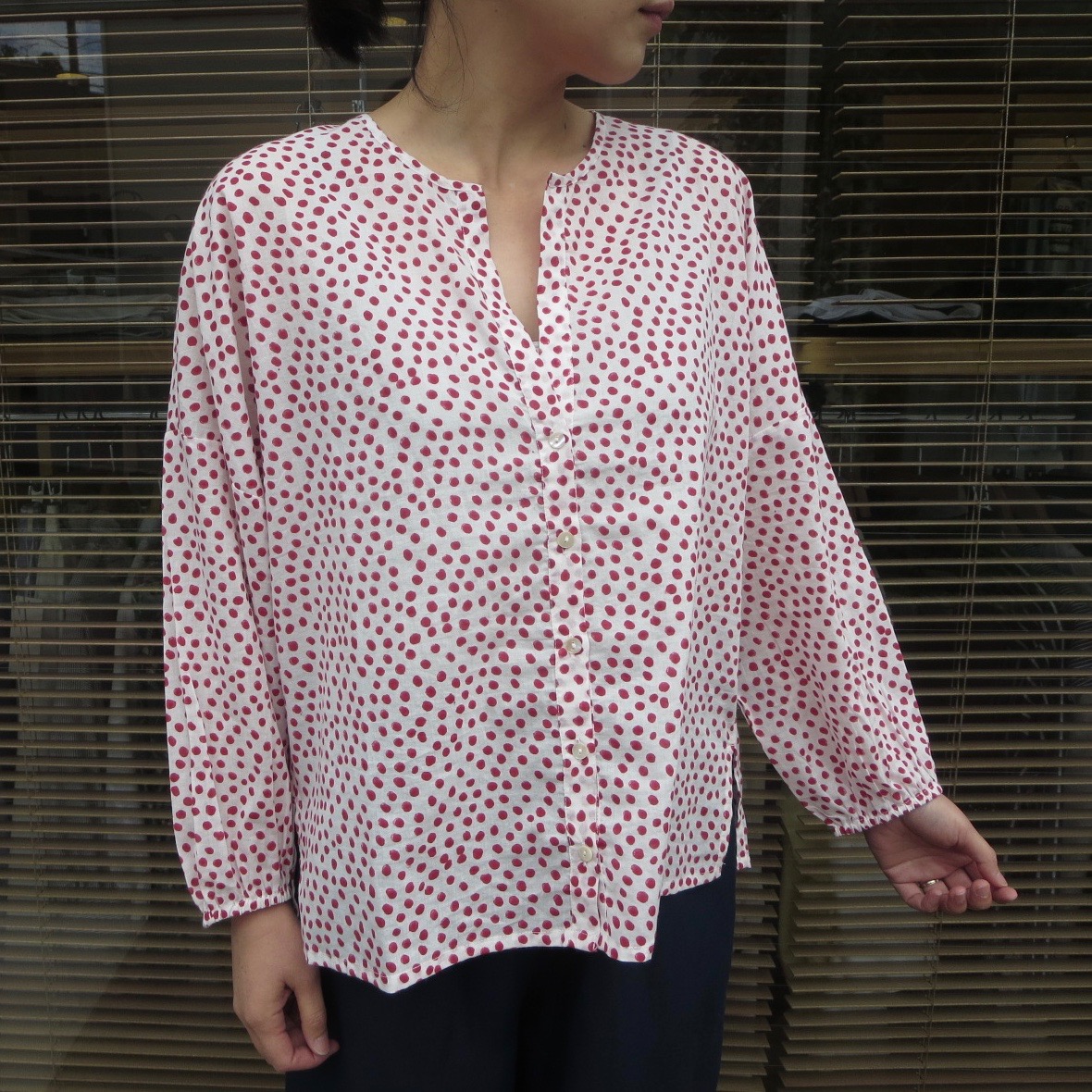 手描きのドット柄を薄手のコットンに乗せた、エスニック感が溢れたブラウスは、ふんわりとしたボリュームのあるシルエットでリラクシーな着心地です。