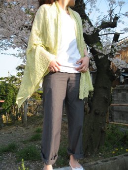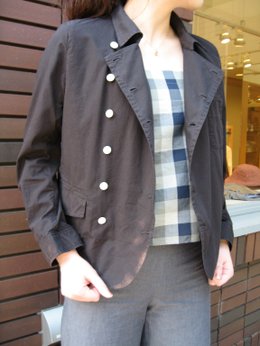 今の時期、羽織るのに丁度いい薄手のジャケットが入荷してきました。ボタンの白がポイントです。インナーブラウスはノースリーブで、バックがクロスしていてかわいい!カーディガンを上に着たり、中にTシャツを重ねてもいいですね。