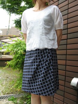 さて、明るい気候にぴったりでキャッチーなアイテムが入荷してきました。ブラック×ブルーの配色チェックは、シックながらもレトロポップな雰囲気。タックドレープがポイントのスカートと、リゾート感たっぷりのベアトップワンピースの展開です。スカートには、少し甘めのレースブラウスを、ワンピースはぜひ一枚で着ていただきたいですが、パーカーを羽織ったりするのもステキな着こなしです。