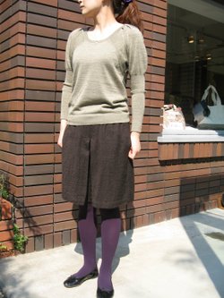 パフっとした袖が印象的なニットは、ラメが入っていてフェミニンな雰囲気ですが、落ち着いた色目で合わせやすく一枚で様になるニットです。一見スカートのようなキュロットパンツでシンプルに着こなしてみました。