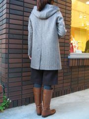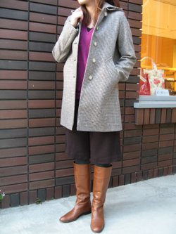 茶系の千鳥格子の「HATFIELD」というモデル。カジュアルはもちろんきれいめスタイルにも対応できます。フードの着脱も可能なので、シーンに合わせて使い分けていただくこともでき、便利ですね。今回はハーフパンツで合わせていますが、スカート、ワンピースやスーツに羽織っていただいても◎。ウールなので暖かさも抜群です。