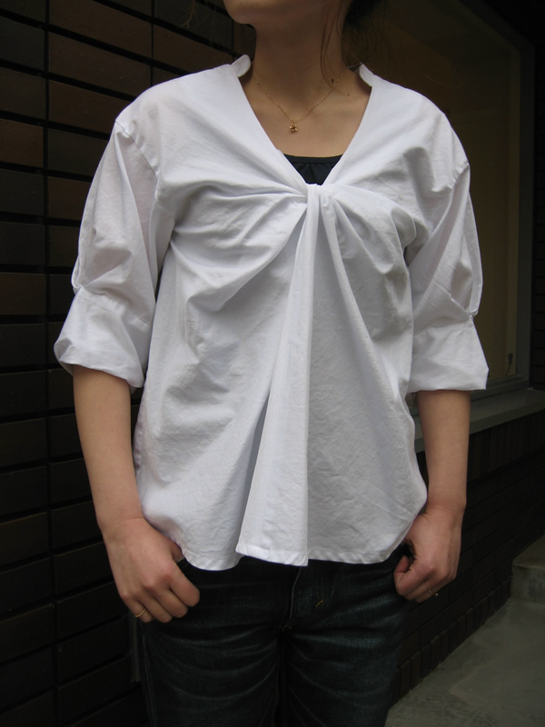“ひとひねり”の表現にぴったりな、胸元でひとねじりしているブラウス。一見リボンのようにも見え、袖口も少しだけねじれています。コットン100%の素材で肌触りも気持ちが良く、洗いざらしでさりげなく着こなしていただきたいです。     ・ブラウス  ¥12390  カラー: ホワイト  ネイビー