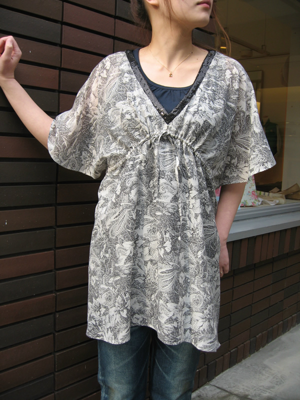 コットン×シルクの透け感のあるさらっとした生地に、大人っぽい花柄がプリントされたチュニックブラウス。襟元には、スパンコールで縁取りされてゴージャス感をプラス。胸元の紐でギャザーの寄せ具合を調節できるので、今回のように寄せていただいてもいいですし、伸ばしてストンとさせても◎。     ・ブラウス  ¥16590