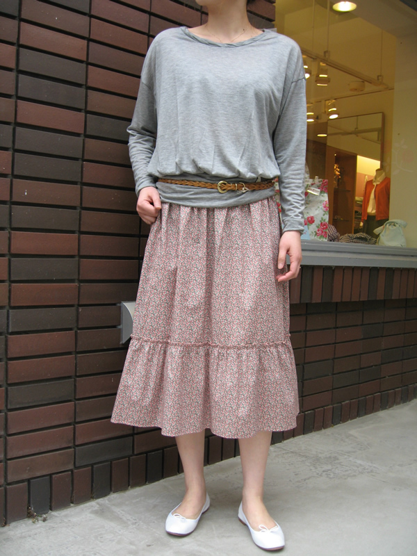 リバティを使用した、キャミワンピース。胸の部分にゴムが入っているので、ロングスカートとして穿いてもかわいいですね。以前ご紹介した、ミリタリージャケットなどを羽織るのもおすすめです。