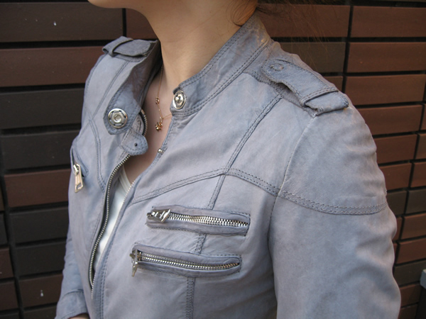 アスファルトのようなグレーのジャケットはクールな印象を与えますが、その中にも女性らしさが漂うのは、レザーだからこその質感やコンパクトに着るサイズ感であったりします。シープスキン(羊革)の滑らかな着心地は病みつきになりそうです。