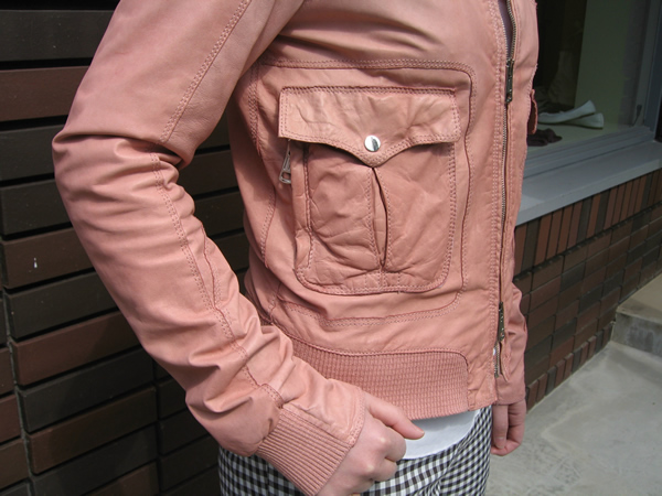 裾と袖口がリブになっていて、少しメンズライクなデザイン。しかし、レザー独特の雰囲気のあるピンクの色合いがフェミニンさを与えてくれます。立体感のあるポケットも◎。