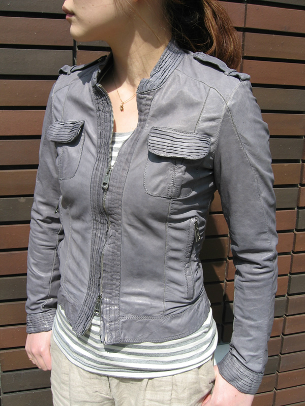 フリルのように見える細かい手仕事が、袖口やフラップポケットなどに施されています。シンプルなデザインの中にも革ならではのヌーディ感が、しっとりとした大人の女性を演出してくれます。