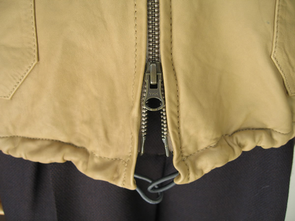 上と同シリーズのフード付きブルゾンタイプです。柔らかなレザーだからこそできるデザインですね。革は薄いから寒そうと言われる方もいらっしゃいますが、保温性は抜群で、一度温かさを閉じ込めると、その熱を逃がしません。