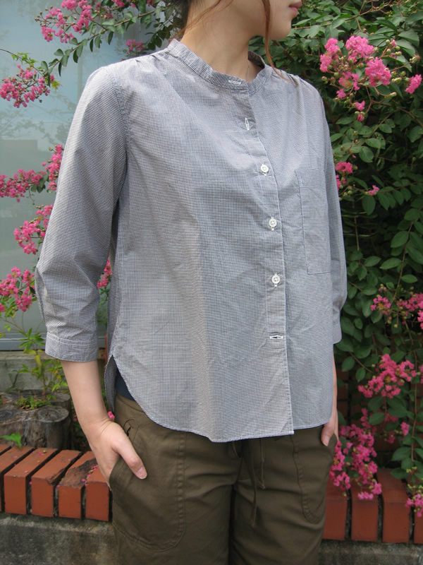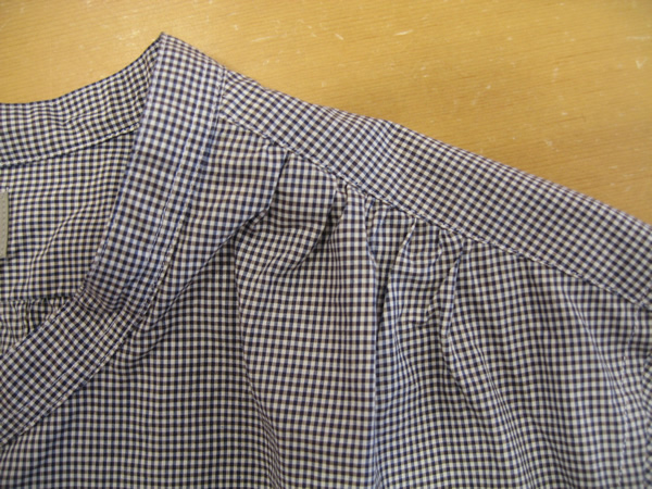 <写真左> 薄く起毛をかけたような優しい肌触りと、洗いをかけたような凹凸感を持った素材で着心地も軽いです。よ~く見ると縦糸と横糸の色が違う細かいギンガムチェック。肩の部分にギャザーを細かく寄せたリラックス感のあるシャツに仕上がっています。