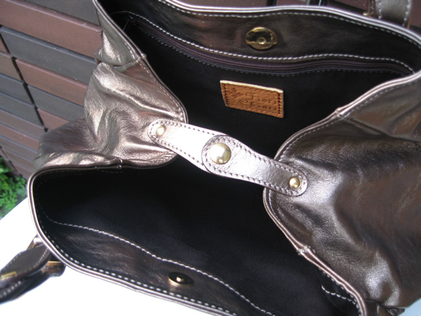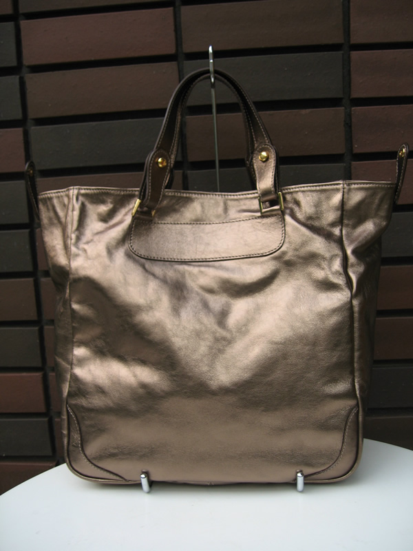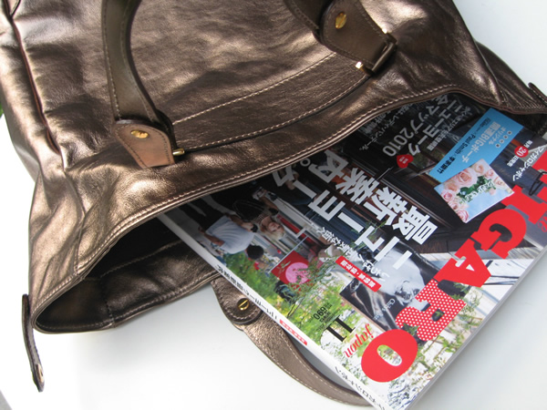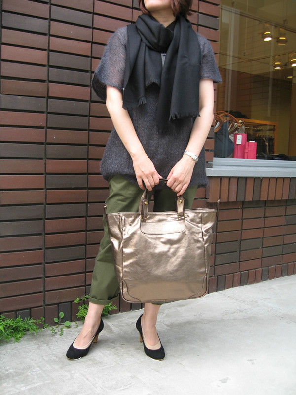 写真では少しゴールドっぽく写っていますが、実際はブロンズに近い色のトートバッグ。ブロンズの光沢感がおしゃれのスパイスとして楽しめそう。ミリタリーテイストやレザーなどのハードなものと組み合わせると今年流です。両側のマチの部分に付いているベルトを留めれば谷折りのようにマチを内側に寄せることで見た目をコンパクトにもできます。A4サイズも楽に収納できるので、荷物の多い方にもおすすめです。