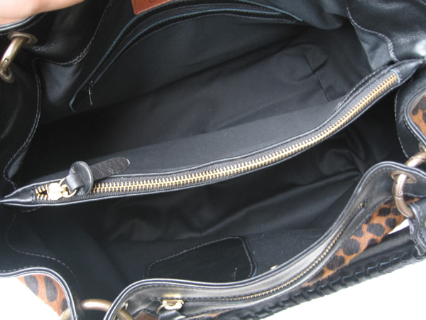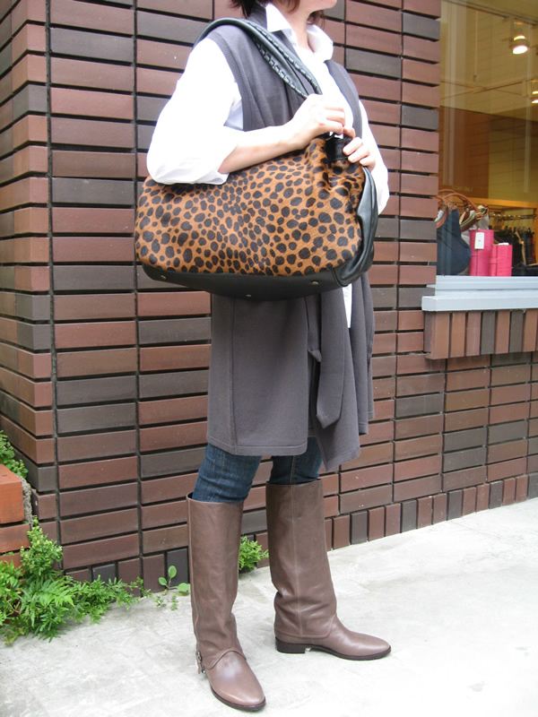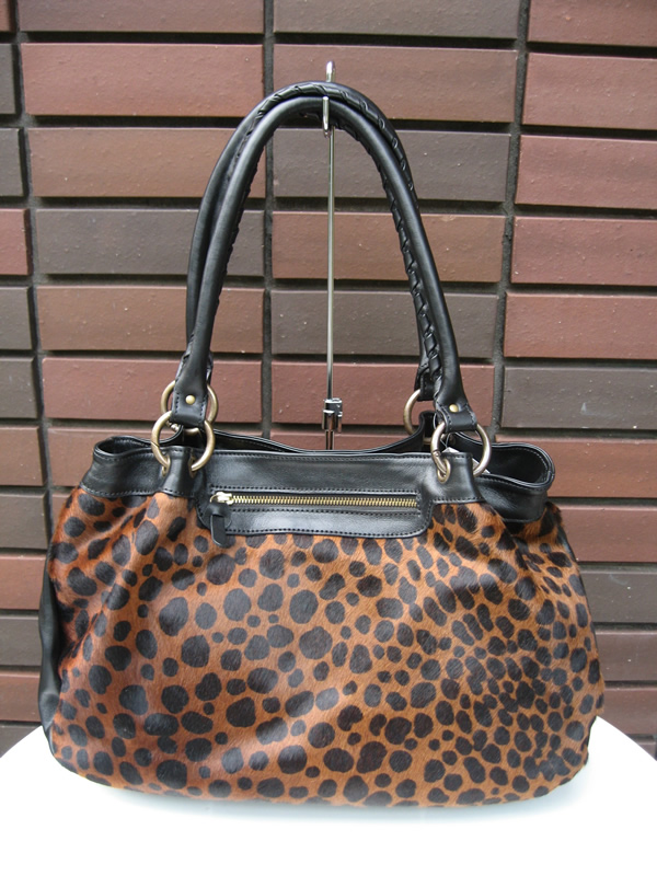 ダルメシアン柄でも茶×黒の組み合わせが大人っぽいざっくりとしたトートバッグ。大きく取った持ち手が肩に掛け易くしっくりと馴染みます。また、持ち手部分の編み込みや、本体と繋ぐアンティーク調の丸い金具が全体を引き締めています。内側は、真ん中に大きなファスナーポケットの仕切りで分かれており実用的。仕事で使う際には片方に書類、もう一方に私物と、分けてもいいですね。底鋲も付いていますので、ちょっと床に置きたいときも安心です。