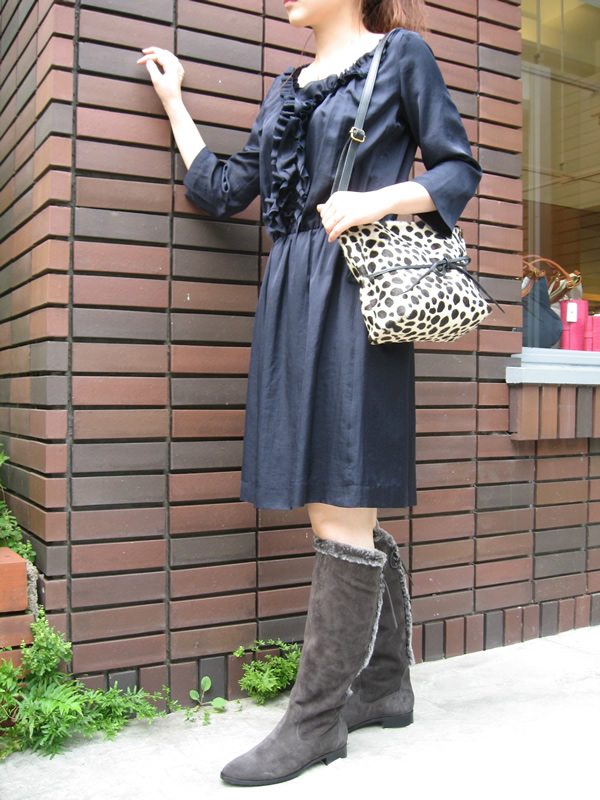 リボンがポイントの白×茶のダルメシアン柄の小ぶりバック。小さいながらも存在感たっぷりで、コーディネートのアクセントになること間違いなしです。持ち手部分が取り替え出来る様になっており、長いベルトにすれば斜め掛けも出来ます。外ポケットに加えて、内側もサイドに小分けポケット付き、口もファスナーで開閉なので、とても機能的です。アニマル柄の小物は今年押さえておきたいですね。
