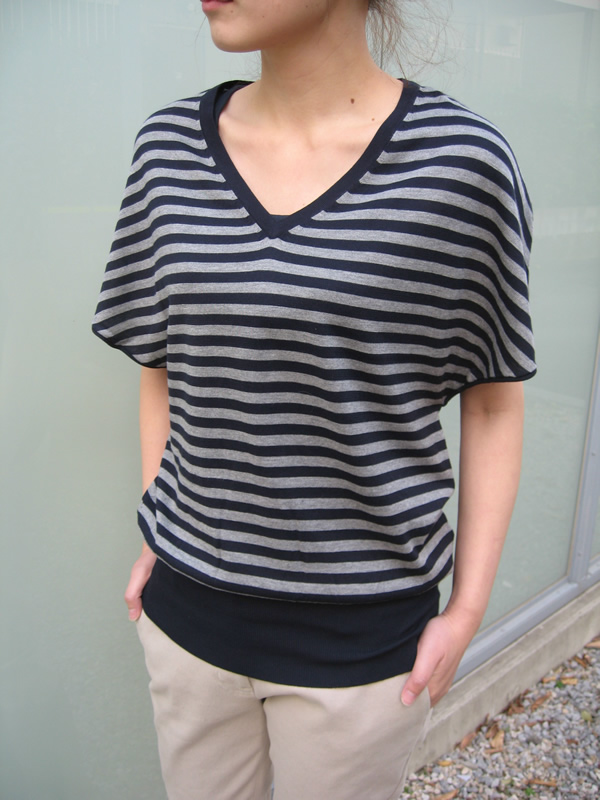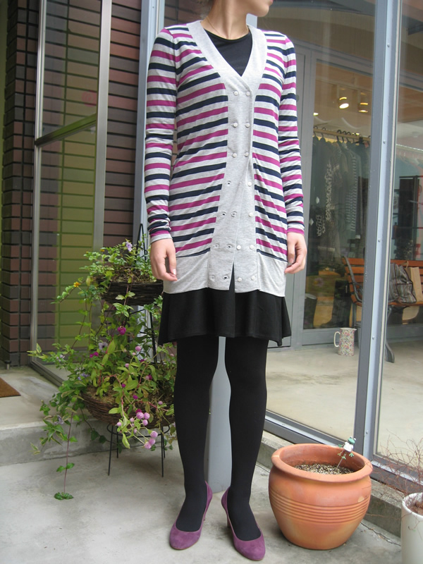 フロント部分が2枚重なっているので、無地とボーダーを重ね着しているかのようなカーディガン。フロントの裾部分がバルーンのような作りになっています。今回は内側の釦を留めて、外側は開けて着用。2枚とも釦を開けても閉めても、また違った表情になって、着方を楽しむことのできる一枚です。