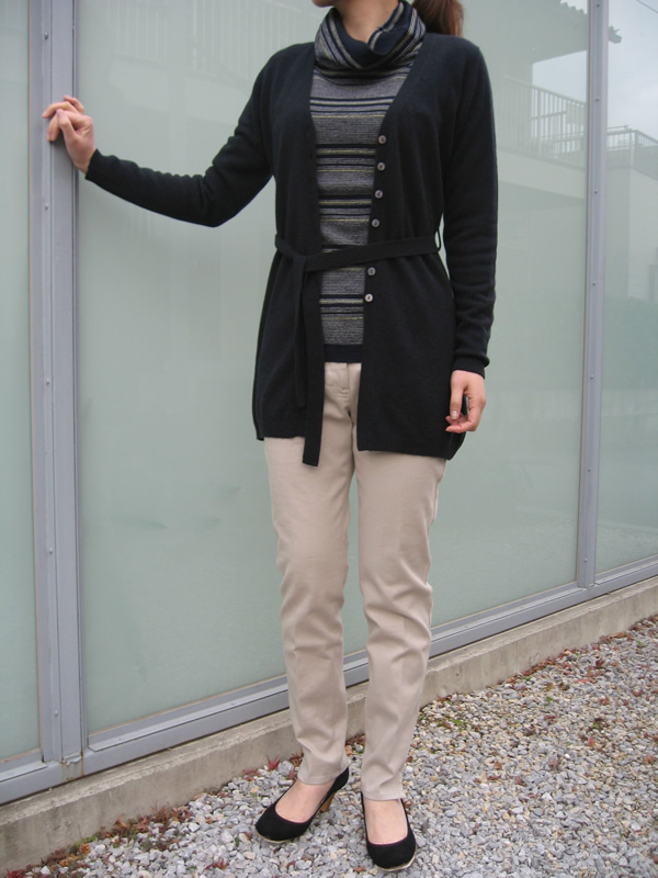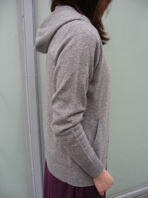 少し着丈の長いカーディガン。シンプルですが、フードでカジュアルダウンしているあたりがに、わざがキラッと光りますね。滑らかな着心地にうっとりです。