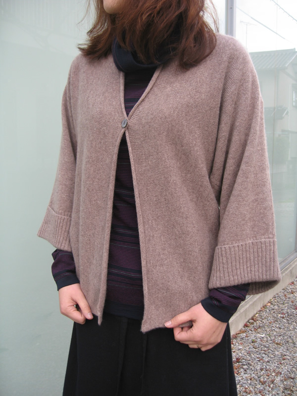 やっこのような形のひとつ釦のカーディガン。袖口のリブに折り返しや、バックの背から腕へと続くラインがアクセントになっています。カラーも優しいモカブラウンで、インナー次第で雰囲気を色々変えていただけます。