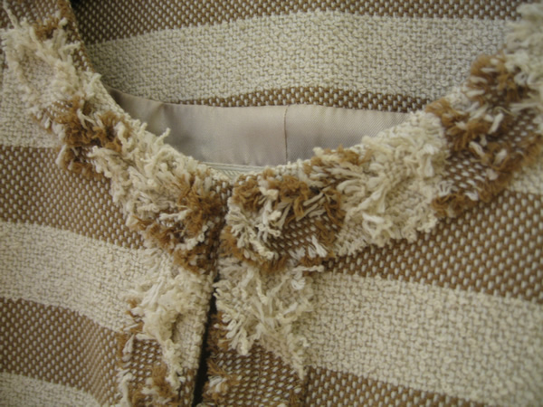 同系色の柔らかいベージュ×モカの配色がカジュアルになり過ぎずに、清楚な雰囲気を醸し出しています。凹凸のある生地感で、さらに端を裂いた同生地で、フロントやポケット部分を縁取りしていて、ノーカラージャケットに立体感を与えています。