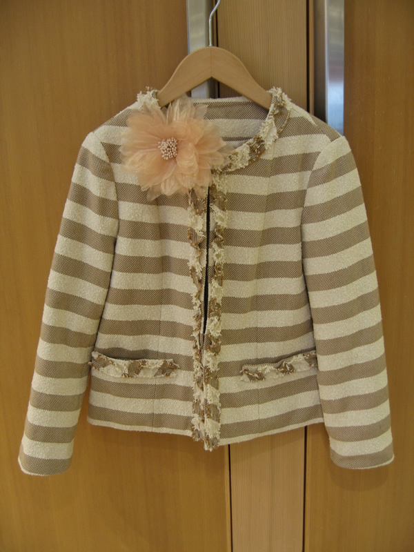 先ほど、オケージョンでも着まわしていただけるシンプルな“万能ジャケット”をご紹介しましたので、次は“華やかジャケット”をご提案します。こちらも普段使いはもちろんのこと、様々な行事やイベントにも対応できる一枚です。
