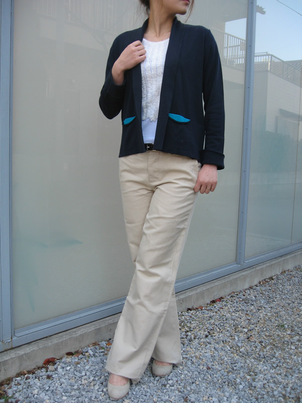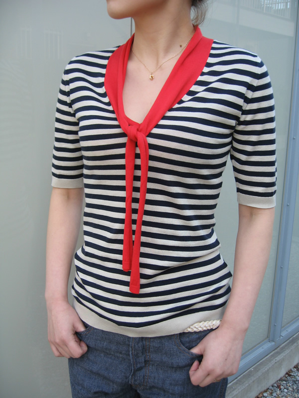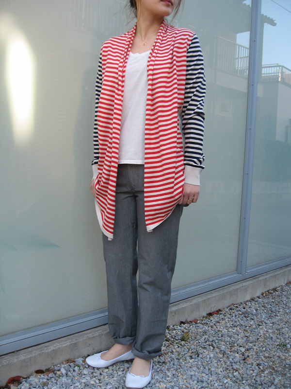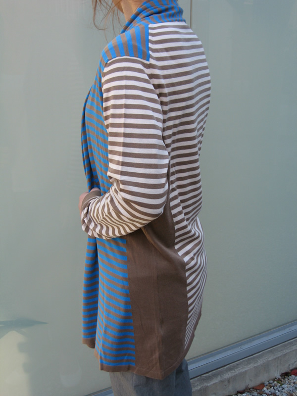 襟部分と前身頃は、鮮やかなボーダー。サイドは、無地で、縦のラインをシャープに見せる効果も。袖・後ろ身頃は、シンプルなボーダーですっきりと。