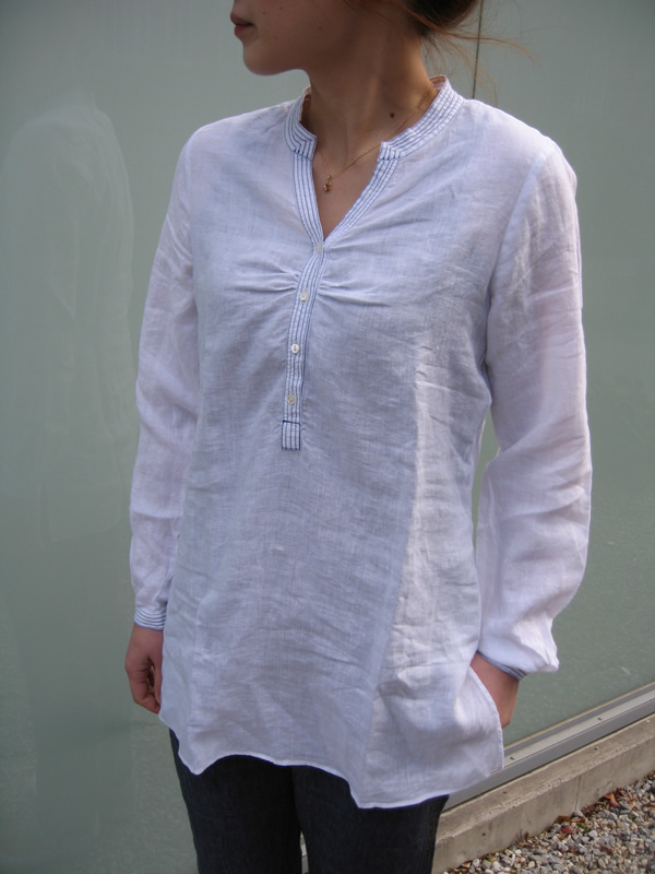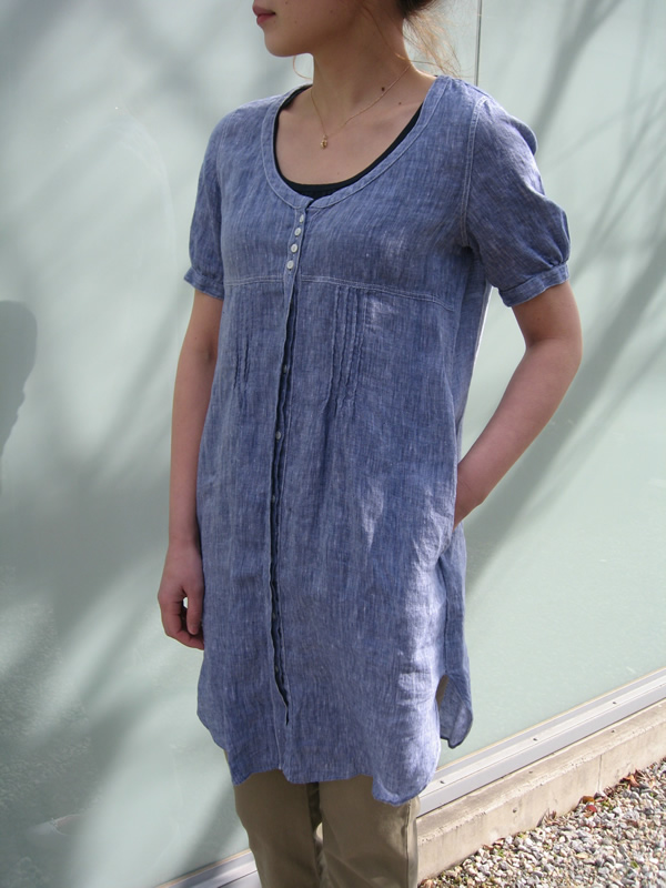 チュニック型のリネン半袖シャツです。大きく開いた胸元がすっきりとした印象に。胸の切り替えまでは、釦が密に付いていてかわいらしい雰囲気も忘れません。その下からは、比翼釦になっていて、見た目はプルオーバーですが、全開できますので羽織って着ていただくのも可能。またポケットが両サイドに付いているのも嬉しいですね。白に関しては、上のモデルと配色が同じでブルーのステッチが効いています。