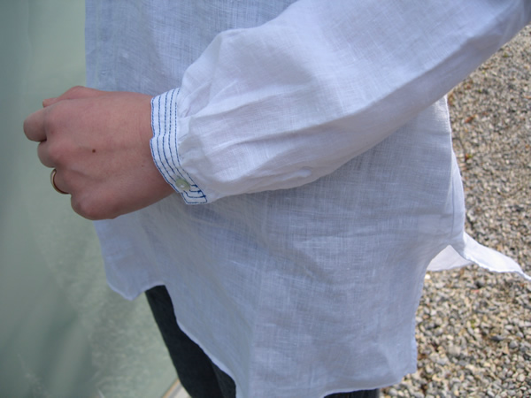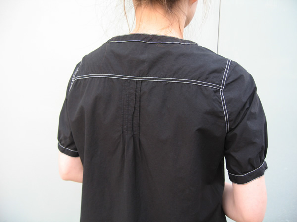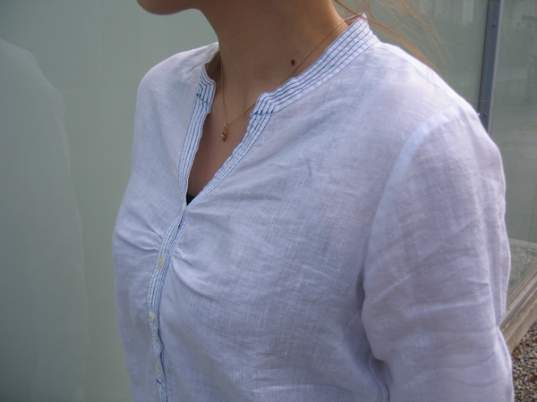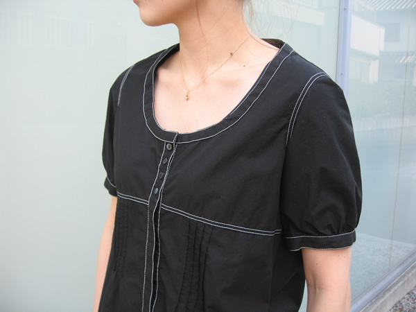 真っ白な中に、襟と袖口のブルーのステッチがとても爽やか。また胸元のさりげないギャザーは全体の雰囲気を立体的にみせてくれます。