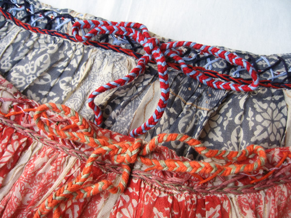 波型にカットされた生地が重なっていて、程よいボリュームと立体感を生み出しています。ウエスト部分もさりげなく刺繍が施してあったり、ウエスト部分のリボンもカラフルでポイントになっています。