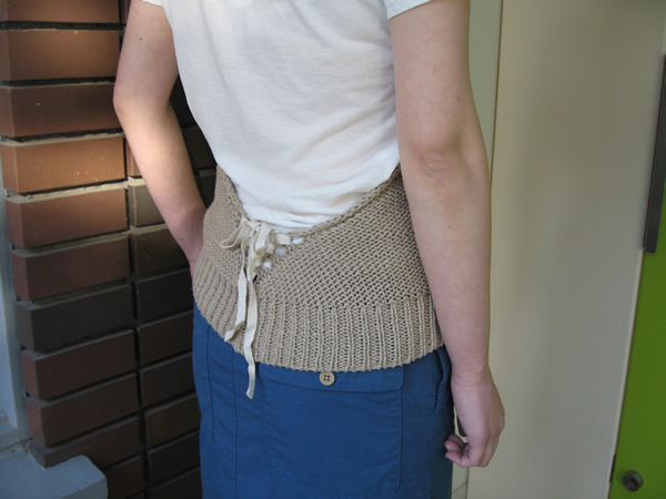 背中は、ざっくりと開くので、正面とはまた違った雰囲気に見えます。腰で編み上げになっていて後ろ姿まで、素敵な一枚です。