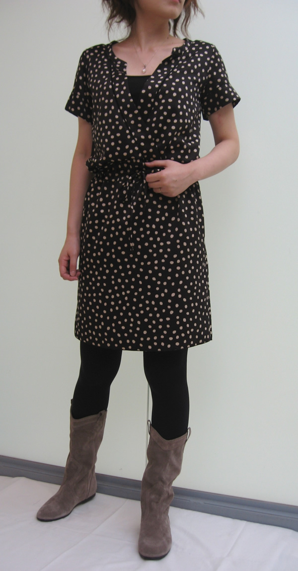 ブーツを合わせれば、全体のバランスが取りやすいので、柄物ワンピースを着ても、どこか馴染んでくれます。左のワンピースは、変形ドットが散りばめられたブラウジングワンピース。右は、“ペーパーローズ”と名づけられたリバティ生地を使用したワンピース。コクーン型に、大きな釦が少しレトロな雰囲気を醸し出しています。