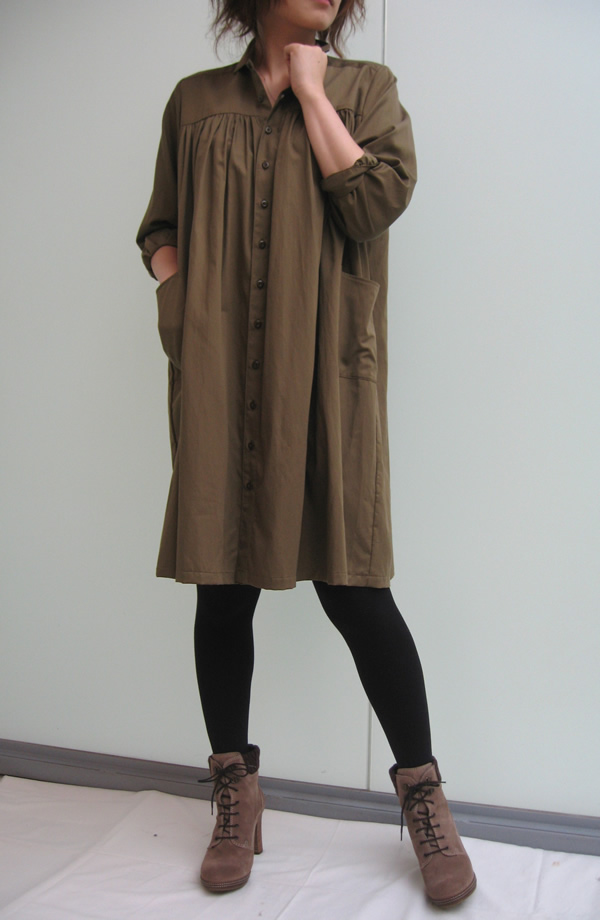 ギャザーがたっぷりと入ったシャツワンピースは、全体のシルエットがストンとしているので、足元はショートブーツですっきりと見せるのが◎。何気ない雰囲気のワンピースですが、個人的にはとても気になる一枚です。もちろん、羽織る感じで着ても素敵ですね。