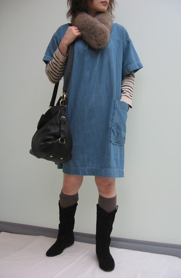 ・ワンピース ¥19,740 「HARRISS」   ・インナーニット ¥22,050 「MARGARET HOWELL」   ・バッグ ¥30,450 「Waterlily」   ・ファー ¥18,900 「HARRISS」