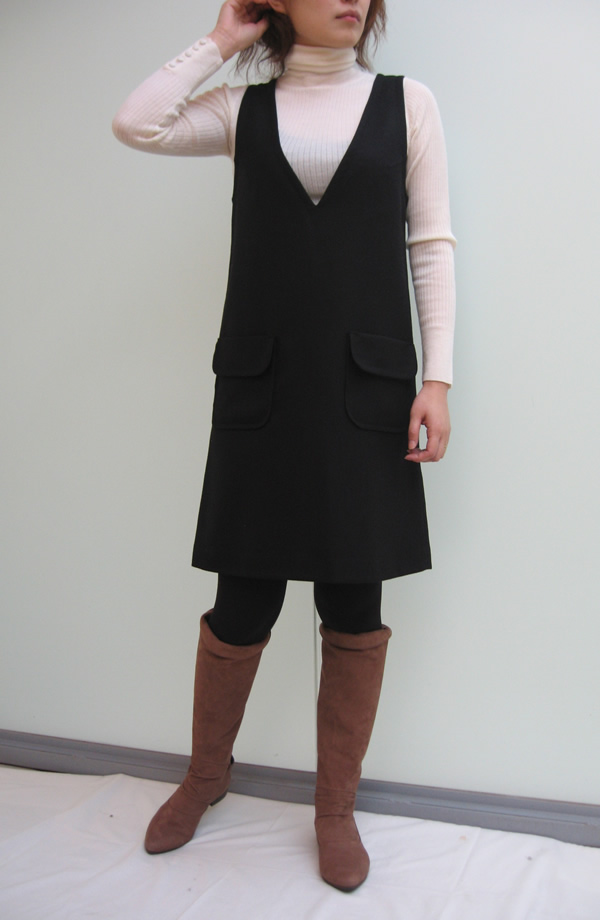懐かしいと感じる方も多いのではないでしょうか、ジャンパースカート人気の復活です。すっきりとしたラインに、深Vがシャープな印象に仕上げてくれます。また、ジャンパースカートといったらタートルネックは欠かせませんよね。全体はレトロな雰囲気ですが、脚元はポインテッドトゥで、洗練された印象にすることを忘れずに。