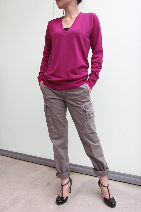 人気の秘密は、程よいルーズ感、着丈が少し長めで、くしゅっとブラウジングできてすっきりと見えるから。シンプルなのに、この雰囲気を出せるのはさすが「JOHN SMEDLEY」です。昨年に比べて、少しVの開きが浅くなりました。