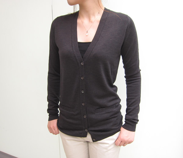 続いては、「JOHN SMEDLEY」の中では、定番として根強い人気を誇るVネックカーディガン。今まで展開しなかったのが悔やまれます…。着てみて、すっきりと見えるシルエットにとても感動です。程よくフィットしているのに、締め付け感は全くなく、体のラインを細く見せてくれます。深めのVネックは、閉めた時はもちろん、開けて着た場合にも、流れるようなラインを作るので、縦長効果バツグンです。