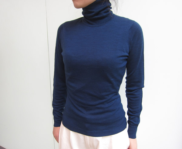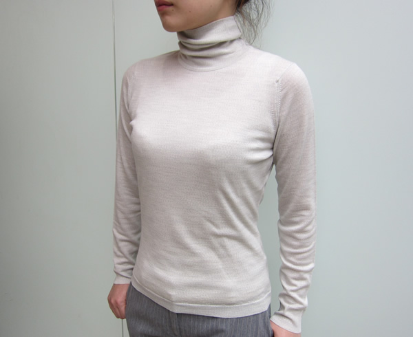 体のラインに沿うようなシルエットで、首回りは締め付け感がない程度のフィット感、一枚でもインナー使いでも、秋冬の必需品となるのは間違いなしです。カラーが豊富に揃っているうちに、手に入れておきたいアイテムです。