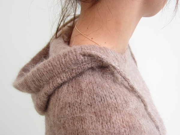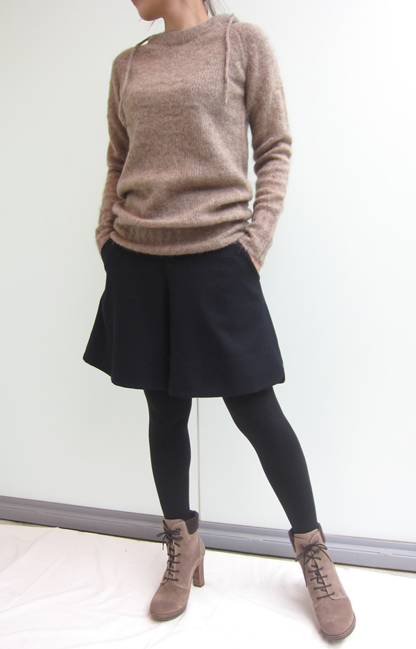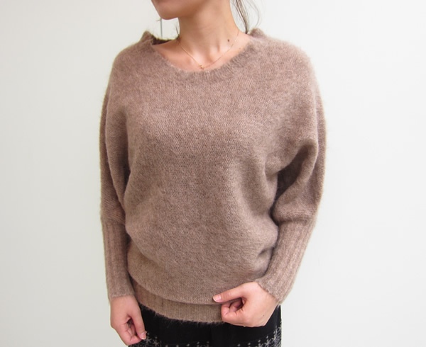 上のパーカーと同シリーズのゆったりニットです。アルパカの少し毛足の長い、モコモコとした雰囲気が、フェミニンな雰囲気たっぷり。