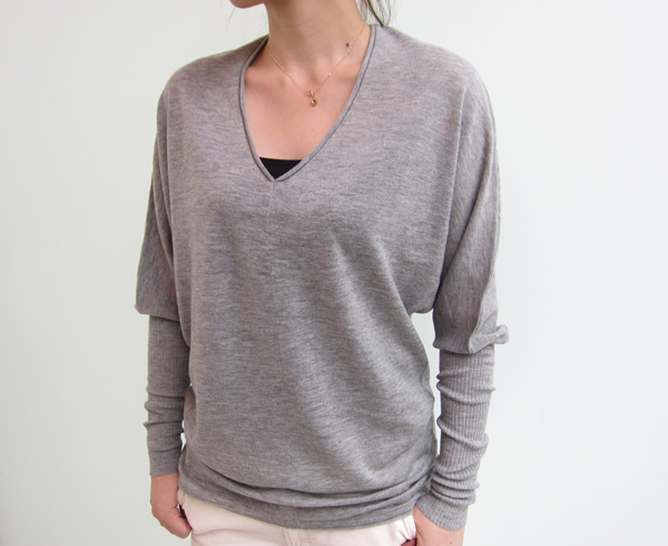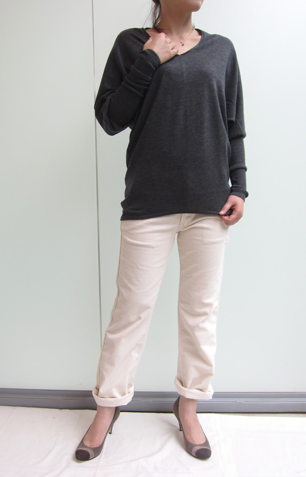 前から後ろに流れるゆな裾のカットだったり、肘くらいまでとられたリブだったりと、女性らしい柔らかなディティールが盛り込まれています。