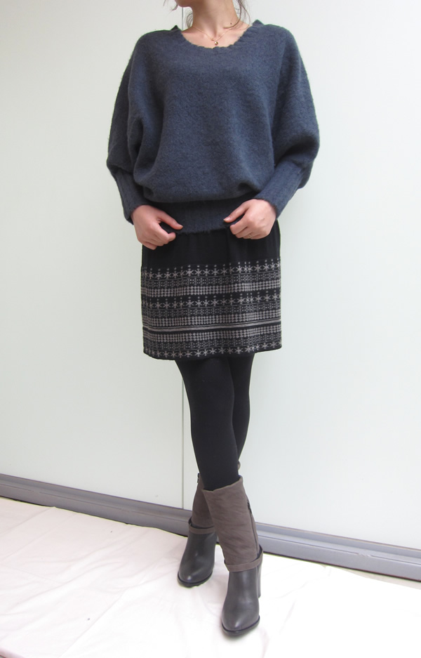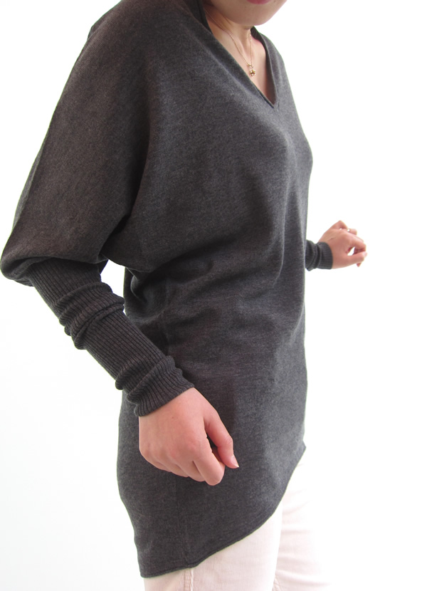 ドルマンスリーブに長めに取ったリブが、メリハリを与えてくれ、ウエストもリブになっているので、スカートなどのコーディネートもすっきりとまとめることができます。