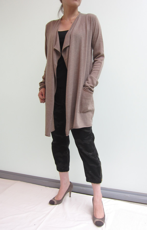こういう流れるようなカットが特徴のロングカーディガンは、「three dots」のシルエットがピカイチです。さっと羽織るだけで、ワンランク上の着こなしを演出してくれます。