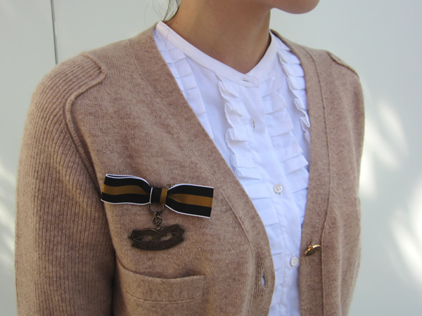 エポーレットスリーブで辛口感を表現。金釦や、ミリタリーモチーフのブローチが付いているなど、レトロトラッドを思わせるカーディガンです。